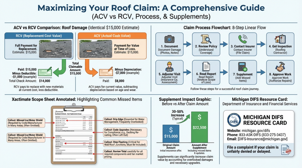 ACV vs. RCV. Replacement Cost Value (RCV) pays the full cost to replace your roof at today’s prices. Actual Cash Value (ACV) subtracts depreciation, so a 15-year-old roof could see a $15,000 job valued at only $8,000. Most Michigan HO-3 policies include RCV. With RCV, the insurer pays the depreciated amount first, then releases the “depreciation holdback” after repairs. You must finish the work to collect the full amount. Our homeowner’s guide to insurance policies covers these types in detail.