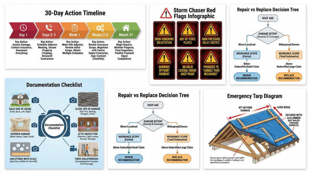 | Day 1 | Confirm safety. Document all damage. Tarp exposed areas. Save receipts. |